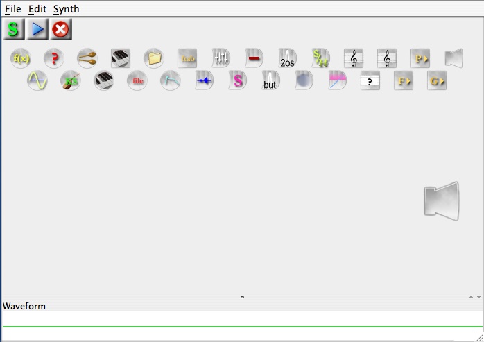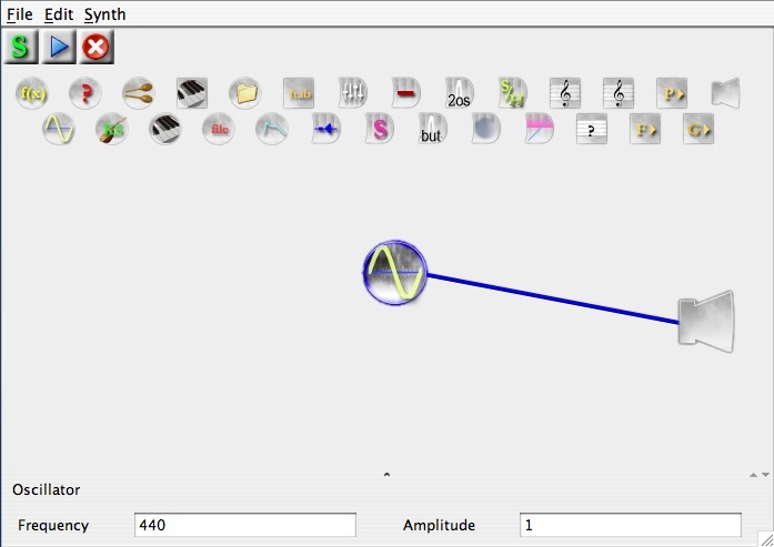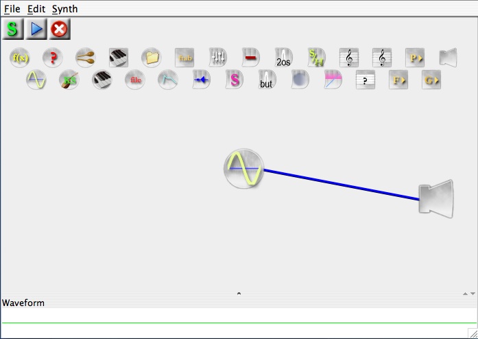 After the window closes, click on the SYNTHESIZE button at the TOP left of the window (it has a green "S" on it). This causes JSYD to COMPILE the file and store a digital representation either in MEMORY or write it directly to a file. More on this later. To hear the sound: