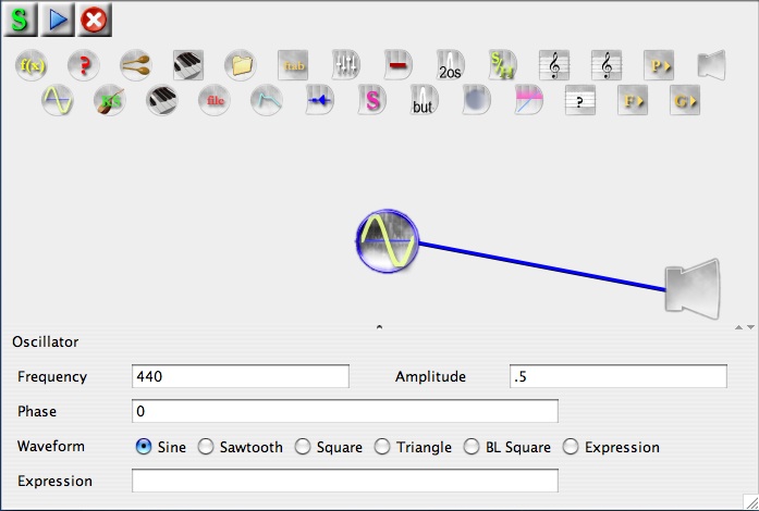 The JSYD window consists of a palette of OPERATORS arranged across the top and an OUTPUT operator located on the right side of the window. Also, there is an area on the bottom of the window which will display either a graphic representation of the waveform of the patch, or a specific operator's various input and output parameters. More on this later. To create a simple JSYD PATCH: