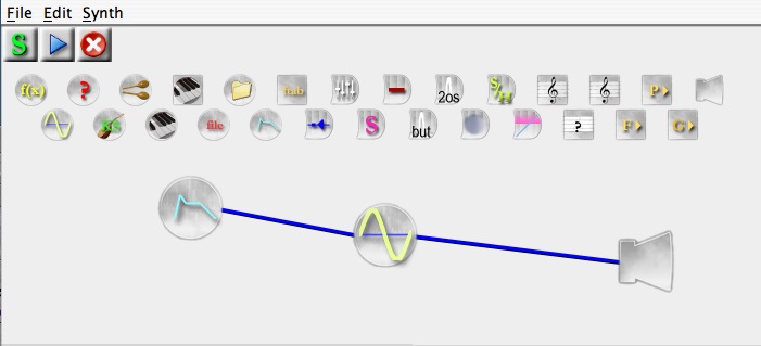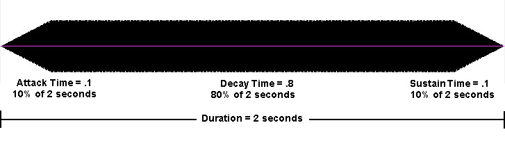 | Computer Music: Musc 216 An ENVELOPE is usually defined as the shape of a sound's amplitude over time (although an envelope can also be applied to other aspects of a synthesized sound such as the frequency, filter bandwidth, etc.). Here is a graph of a simple ENVELOPE applied to the amplitude of the original Simple JSYD Patch (which was created in the 1st tutorial): Click the link below to hear the sound: Envelope1.aiff An ENVELOPE with THIS shape is usually called a "woodwind" envelope and has a total of 3 points (nodes): ATTACK, SUSTAIN, DECAY. An envelope with this shape is typical of sounds made by BLOWING into a musical WIND instrument such as a clarinet, flute, oboe, etc. A sound's (amplitude) ENVELOPE is just as important to the overall recognition of the sound as the waveform itself. In the above sound with the envelope applied, there was a relatively short "attack", a longer "sustain" and then a relatively long "decay." These three terms are usually used to describe the basic points (nodes) of an envelope. If some kind of "controller" instrument is used (for example a keyboard) to play the sound when a key is pressed, then another point or NODE can be described for what happens when the key is RELEASED. Sophisticated synthesizers and software will have more than just 4 nodes. An ENVELOPE is usually applied to the entire duration of the wave. For example, if the wave is 2 seconds long, then the envelope will also be 2 seconds long. The specific points or nodes of the envelope (ADSR) are then placed in varous proportions along the length of the wave. In the above wave (which is 2 seconds long), the attack is .1 (10%), the sustain is .8 (80%), and the decay is .1 (10%). These proportional values add up to 1.0 (100%) which represents the entire duration of the wave (2 seconds), in other words, 100% of 2 seconds. If the wave and envelope were each 6 seconds, then the nodes would still have the same proportions. The following tutorial will show you how to add the above envelope to the 1st Simple SYD Patch which you created the first tutorial. Do this: