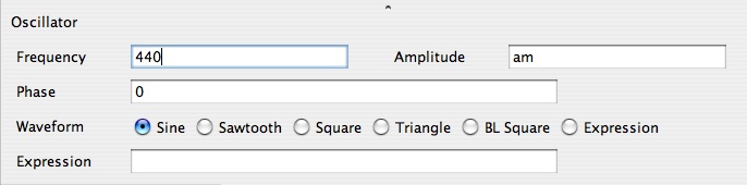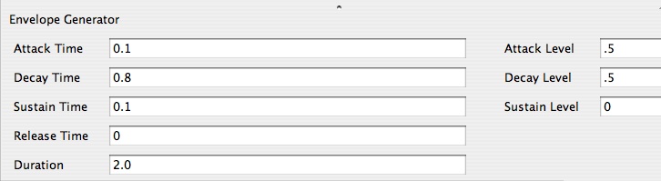 The values in the left fields represent the proportional TIME points or NODES of the envelope as described above (ADSR). The values in the right fields represent the actual amplitude LEVEL values which this operator will pass via the variable "am" in the amplitude field of the Oscillator operator. Time vs. Duration